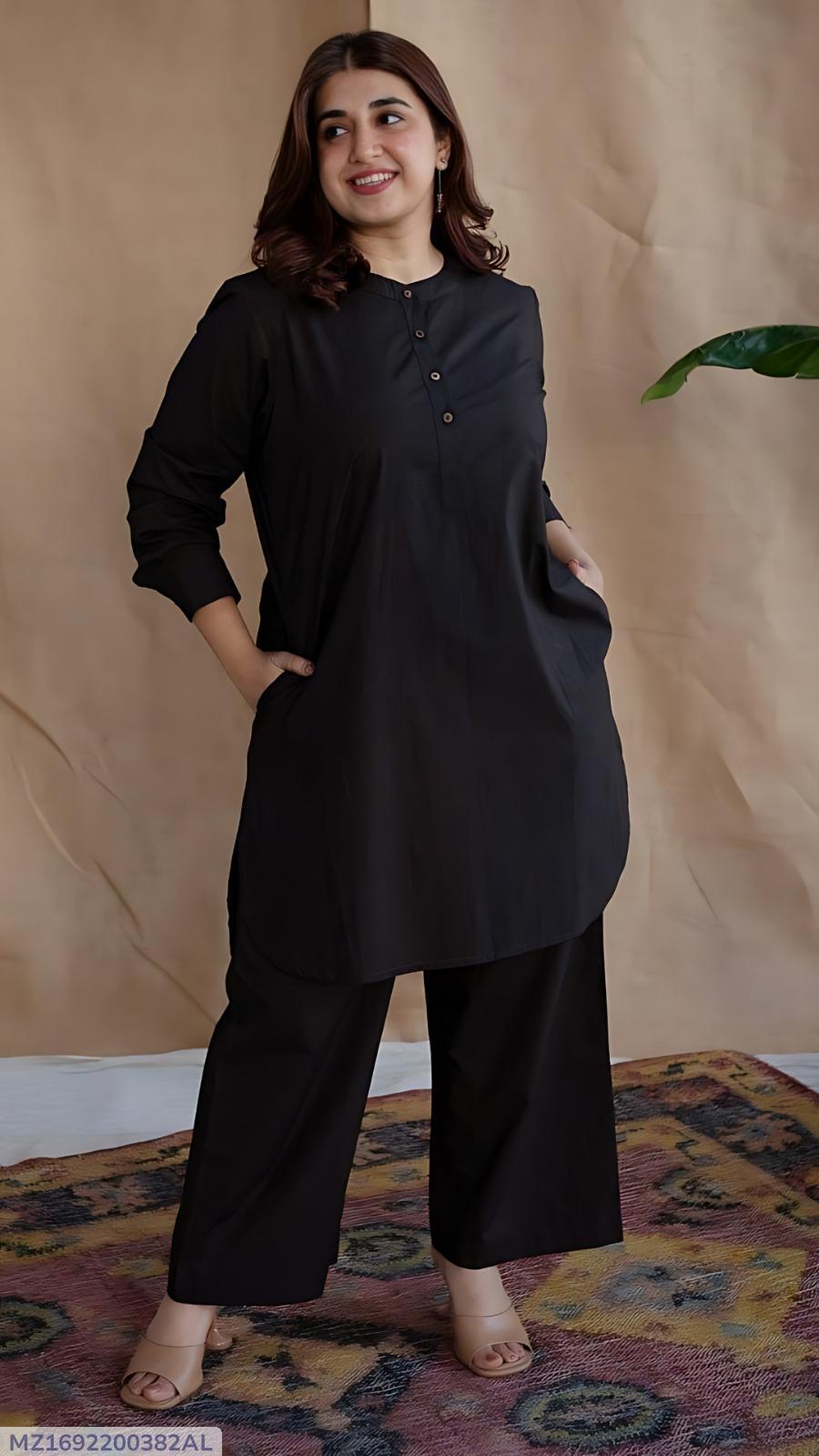 Stylish Women's Stitched Shirt And Trouser Set - 2 Pcs in Classic Black - Plain Cotton Fabric